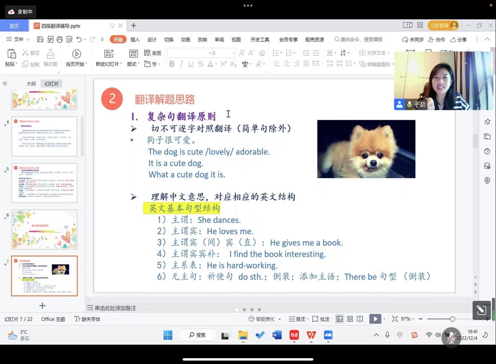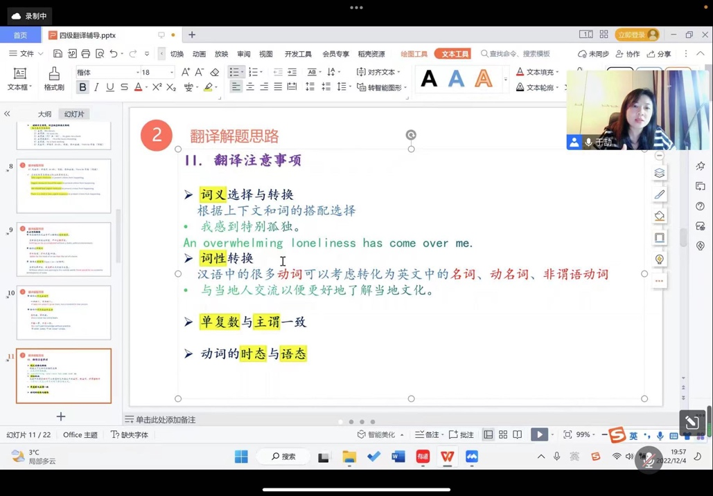 2022年12月4日晚,人外学院举办大学英语四六级辅导沙龙二(翻译写作篇)。本期沙龙由王娟老师主持。沙龙开始,于劼老师与学生一起分享四六级翻译的解题思路;然后,骆一佳老师对四六级写作题型进行细致分析,并通过议论文例文写作为逐步为同学进行详解;最后两位老师为同学们进行现场答疑。