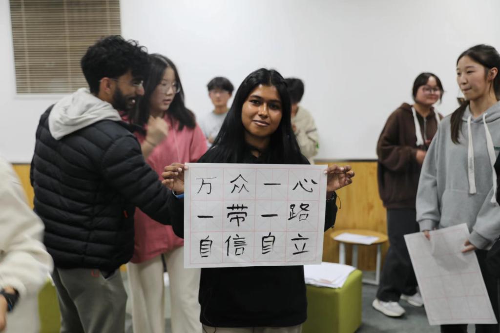 随后,英语专业学生和国际留学生分别通过中英文绕口令、全球美食问答、体验中国书法艺术等形式,加强互动交流、深入探讨“一带一路”倡议的丰富内涵。