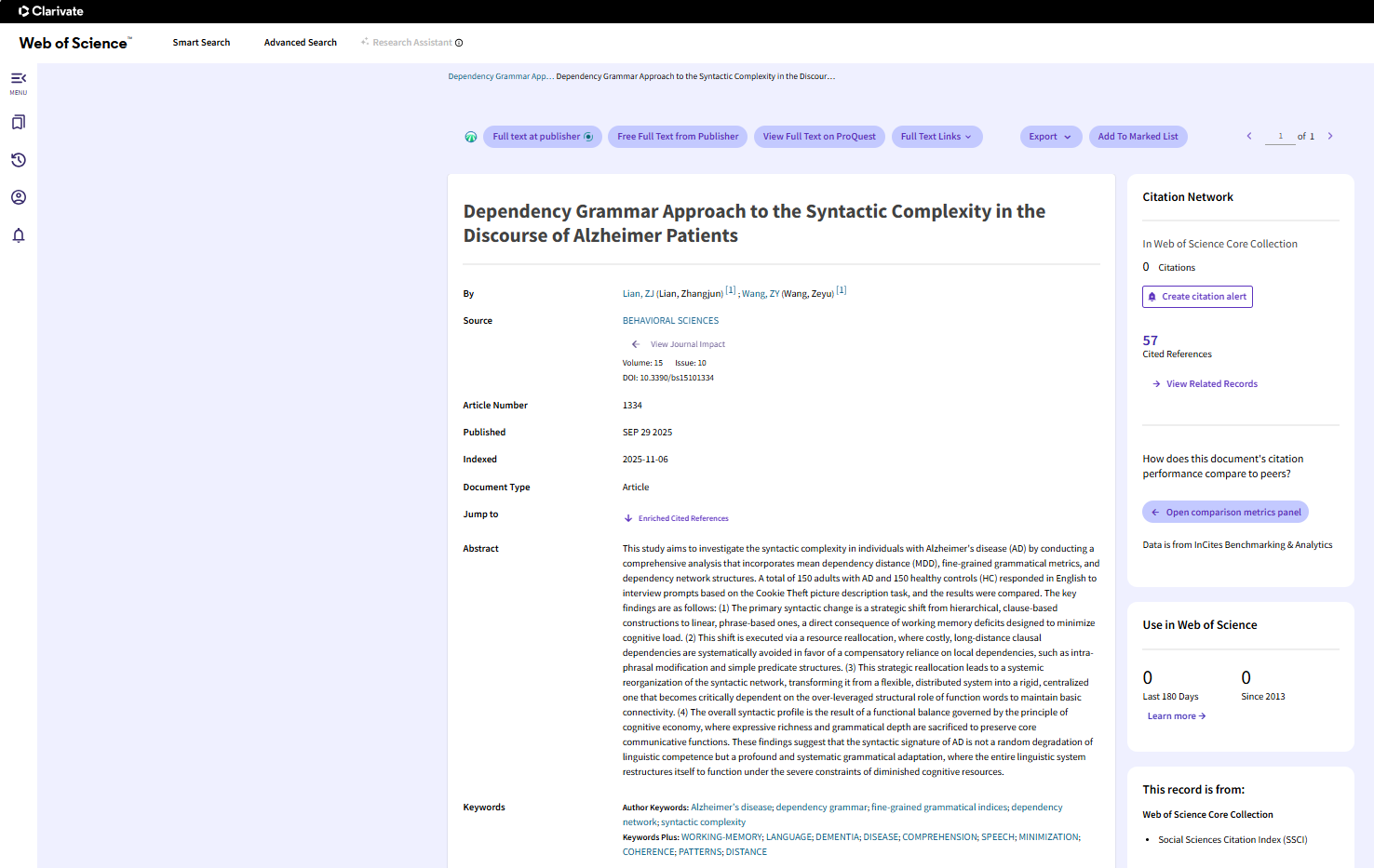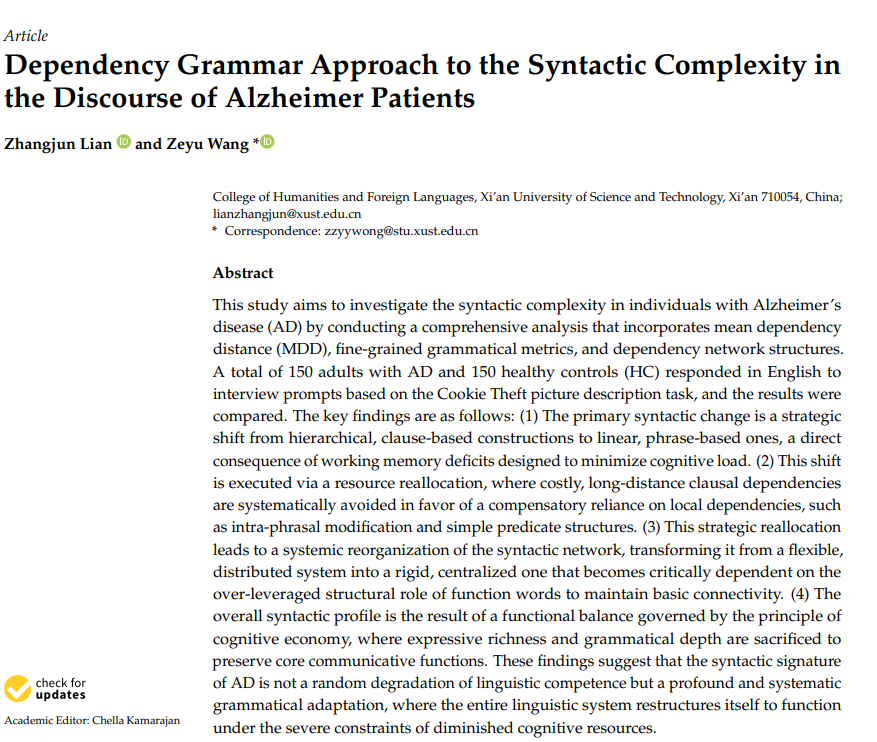 近日,人外学院副教授廉张军博士与2023级硕士研究生王泽宇合作完成的研究论文“Dependency Grammar Approach to the Syntactic Complexity in the Discourse of Alzheimer Patients”在SSCI索引期刊Behavioral Sciences发表。
