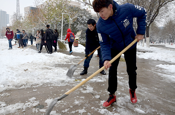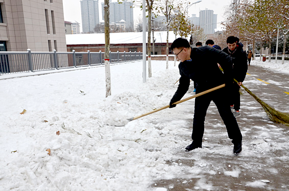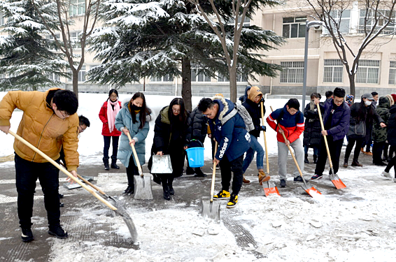 2018年的第一场雪在给大家带来美景与欢乐的同时,也给校园交通和师生的学习生活带来诸多不便。1月4日,beat365在线唯一官网党委积极响应学校号召,组织辅导员老师、分团委学生会干部、全体学生党员、入党积极分子、建档立卡学生及部分没有课的学生开展了扫雪除冰活动。在清扫的过程中,师生们不畏严寒,拿着雪锹、除雪铲、扫帚等工具认真清除冻住的积雪,历经三个小时,将二号教学楼周边的环道清扫一条充满爱心的方便之路,为广大师生的出行安全提供了保障。
