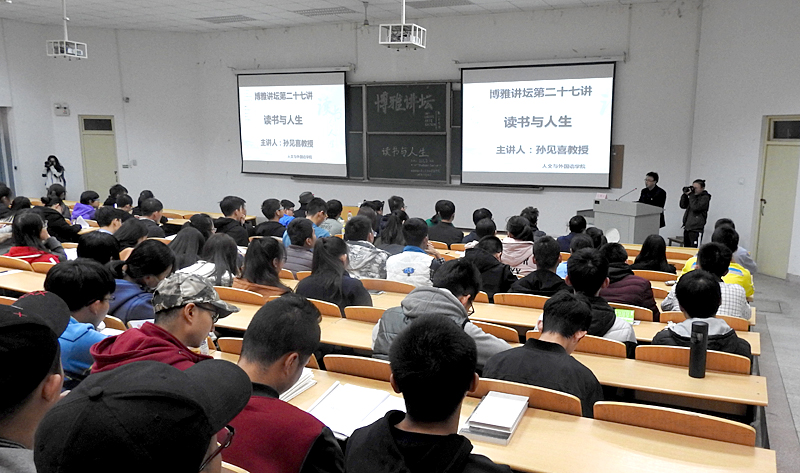 在报告中,孙见喜结合自己多年读书的体会与感受,采取讲故事、唱民歌、朗诵诗作等方式,为大家生动解读了读书的目的、方法、趣味、教益以及读书与民族精神的生成等问题,并以儒家文化结构图和中华道德发展延续图为例,提出读圣贤书是为中国伦理道德补课的观点,希望大家能够多读书、读好书、善读书,通过读书提高修养,培养独立思想和独立人格,积极为传承弘扬中华优秀传统文化、塑造以“良心(道德的自觉意识)”为基础的民族魂而尽一份力量。报告内容丰富详实,语言生动幽默,情感充沛热烈,说理深邃透彻,受到与会师生的热烈欢迎。