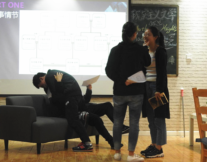“夜阑卧听风吹雨”组一上场便演出了《呼啸山庄》的经典桥段,细致入微的演技和富有趣味性的道具赢得了在场观众的阵阵掌声,随后她们又从文本出发,对作品主要人物和主题进行了分析,揭开了《呼啸山庄》的神秘面纱。