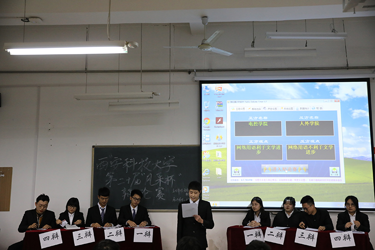 22日晚7时整,材料学院与计算机学院、理学院与管理学院、电控学院与人外学院围绕“网络语言是否有利于文学进步”、“大学阶段,学习和实践哪个重要”等富有思辨性的辩题展开了激烈的辩论。