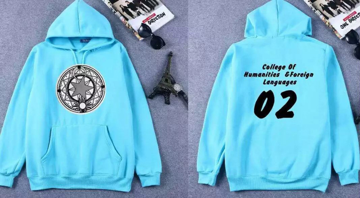 英语1801班班服正面的梅花鹿是班徽,围绕在梅花鹿周围的23朵小花,代表了23个同窗,外围圆圈上的英文字符是班级格言,衣服后面数字01下的英文艺签是每个同学的英文名字。英语1802班班服采用了代表着宁静、清新与自由的天蓝色与极具青春活力的图案搭配,体现了全班同学们积极向上的精神面貌。汉语言专业1801班班服正面的地球俯视图代表了同学心中有梦、志存高远,HYYWX是“汉语言文学”的拼音简写,衣服后面的“读书人”三个字则是同学们对自己身份的期许和警勉。法学专业1801班班服正面的独角兽是勇猛公正的象征,也是司法“正大光明”“清平公正”“光明天下”的象征;衣服侧面是一个古体“法”字,三点水代表了法律法度公平如水的表面,“去”字表示触不平者去之,趋势惩罚;衣服后面由“人外”和一个天平组成,其中“人外”二字的笔画中既有着法律人的强硬,又有着如水般的圆润,天平则象征着公平与公正。
