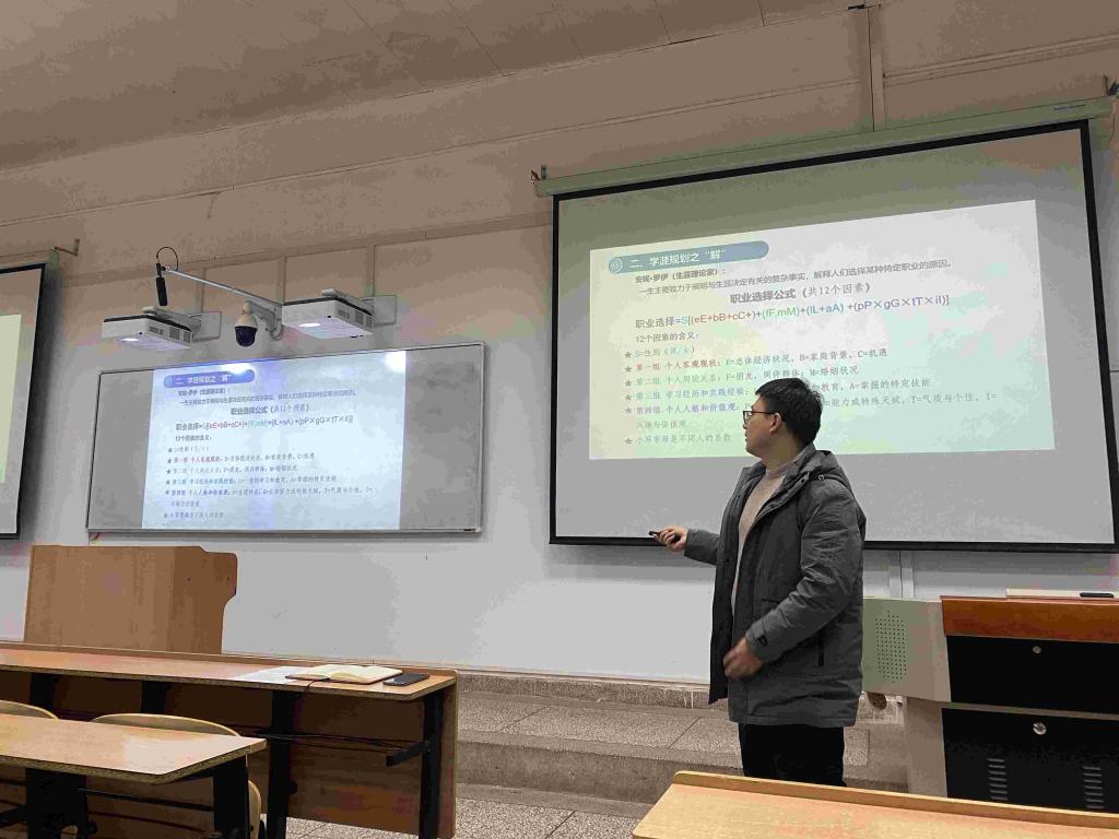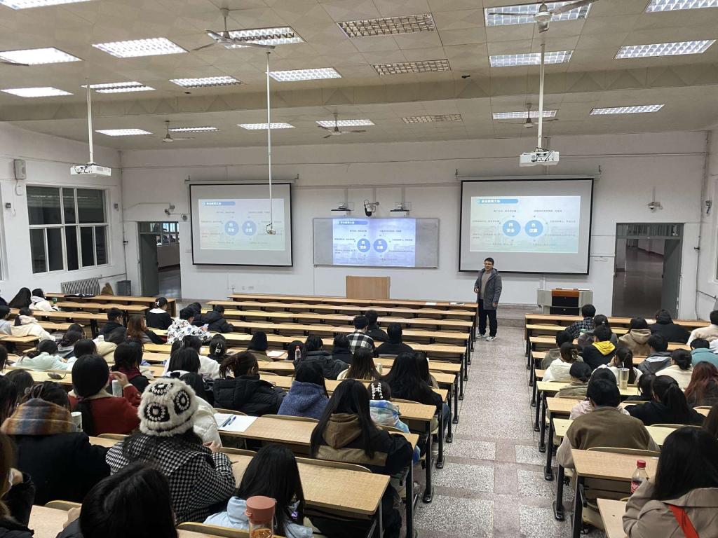 其次,李银亮为同学们进行了本科生学涯规划指导。从学涯规划之惑、学涯规划之解以及学涯规划之路三个方面分别展开论述。首先指明了同学们目前对未来学习生涯的焦虑与迷茫,随后从理论出发,向同学们提供了解决困惑的途径和办法,最后基于专业,给同学们列举未来道路的发展方向。