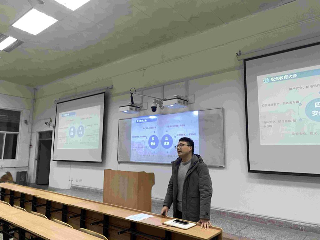 会议共分为两个部分。首先是本科生安全教育大会。李银亮从“四安全,五注意”着手,结合真实案例以及实践经验对同学们进行安全知识教育,提醒同学们要时刻注意个人财产安全、人身安全以及网络安全,注意个人及宿舍的人际交往。