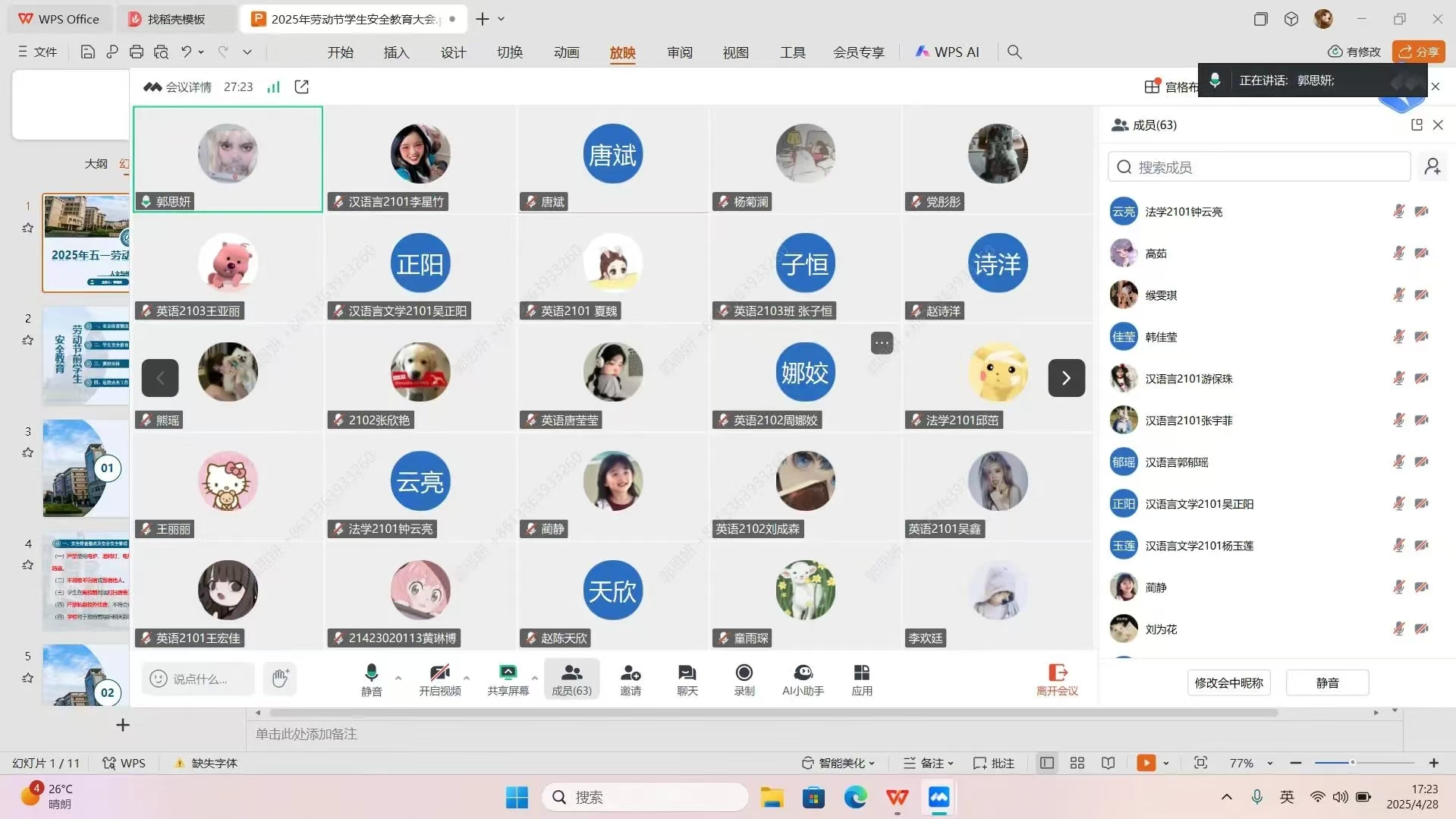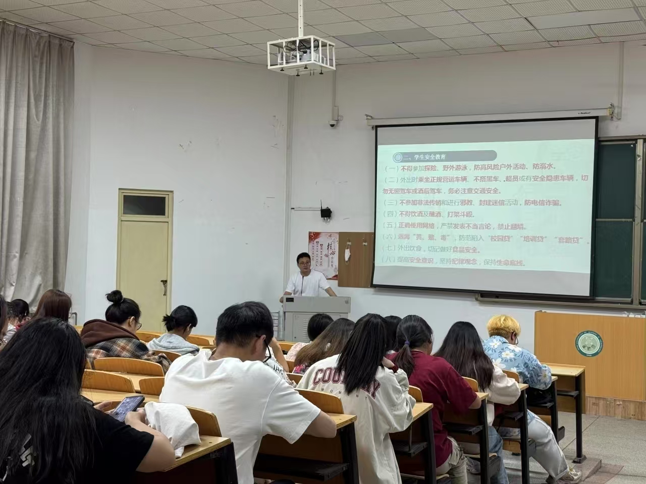 会上,辅导员传达了学校、学院相关工作会议精神,开展了系统性、针对性的安全教育,重点围绕政治安全、交通安全、人身安全、食品安全、网络安全、宿舍安全等进行了强调,要求各年级学生提高安全防范意识,增强政治敏锐力和鉴别力,做好离校前的宿舍、工作室安全隐患排查、五一假期去向登记等工作,不断提高识别风险、规避风险、自救自护的能力。