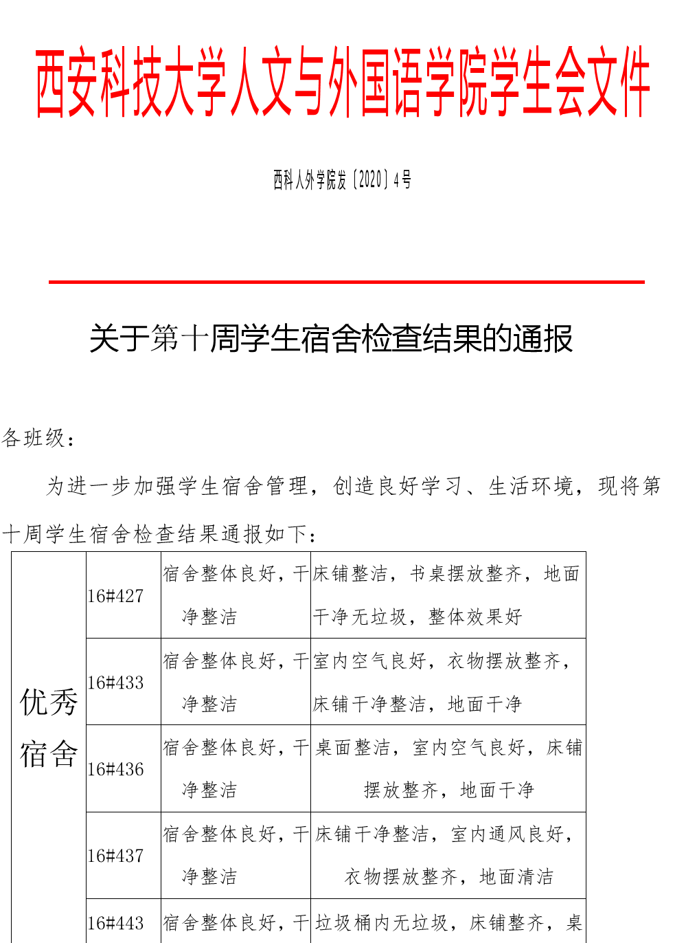 关于第十周学生宿舍检查结果的通报