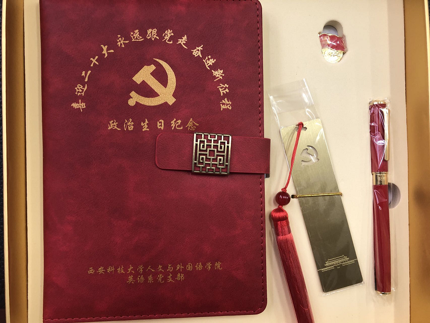 英语系支部统一印制了党员政治生日礼物,包括一份纪念册,一枚党徽、一页书签、一支钢笔、一个笔记本”。在集体唱完国歌后,支委委员杜戍涓和史凤玉把礼物送到每位党员手中支部书记时健带领大家面对党旗,庄严地重温了入党誓词。