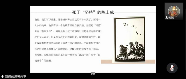 第一组以鲁迅先生的作品为前提,小组代表赵力、于轩、游宝珠、李星竹分别从令他(她)们影响深刻的小说入手详细解说了小说中的典型人物形象与所隐射的社会现实。第二组主要解读作品《白光》,小组代表肖攀分别从主题思想、艺术特色、深层意义三个方面对主人公陈士成的形象进行解读,重点分析鲁迅先生在文中对贪婪者的讽刺意味。第三组以浅析鲁迅作品中的民俗文化为主题,小组成员亚森、谢文馨、张盛雅、屈莹莹、黄楠芳以分—总形式进行深刻分析,其中选取了三篇最具代表性的文章来解读民俗文化的体现之处。第四组以分析鲁迅作品中的女性形象为主题,小组代表周鸿汝以《祝福》中的祥林嫂与《伤逝》中的子君为例,深度剖析了在旧社会大背景下女性意识的觉醒。第五组以《呐喊》、《彷徨》为例分析鲁迅小说中的知识分子的形象,小组代表崔文杰、张馨文从文本出发,结合时代背景,分析吕伟甫、魏连殳等具体人物画像,并阐述塑造人物的深刻意义。