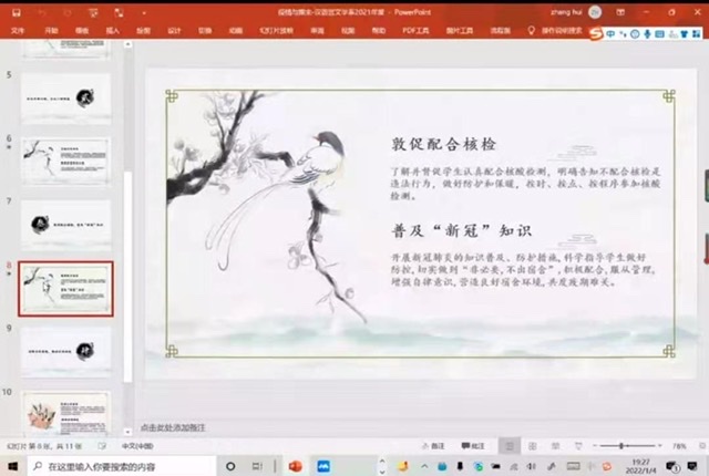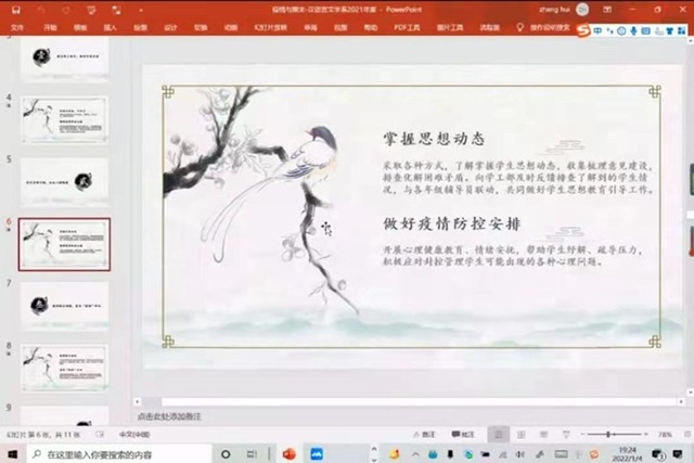 疫情期间,确保学生的心理健康与生命安全同等重要,合理安排“宅居”时光,是充实心灵、缓解焦虑的有效方式。张辉从“做好防控安排,有序线上教学;强化思想引领,关注心理健康;普及新冠知识,敦促配合核检、持续宣传报道,畅通求助通道”四个方面对目前的形势、教学重心进行了简明扼要的概述。中文系各年级学生应保持积极乐观心态,理解并配合学校政策。目前已为各年级学生疫情期间学习重心进行了相关安排,21级开始线上教学,20级即将举办读书会,19级开展考研规划专场讲座,对18级进行毕业论文指导。