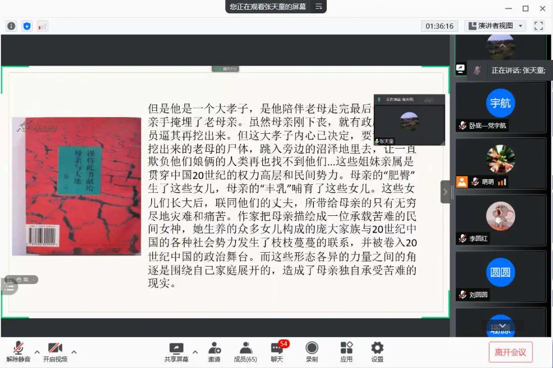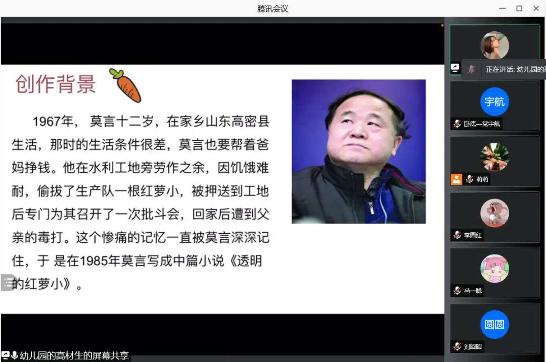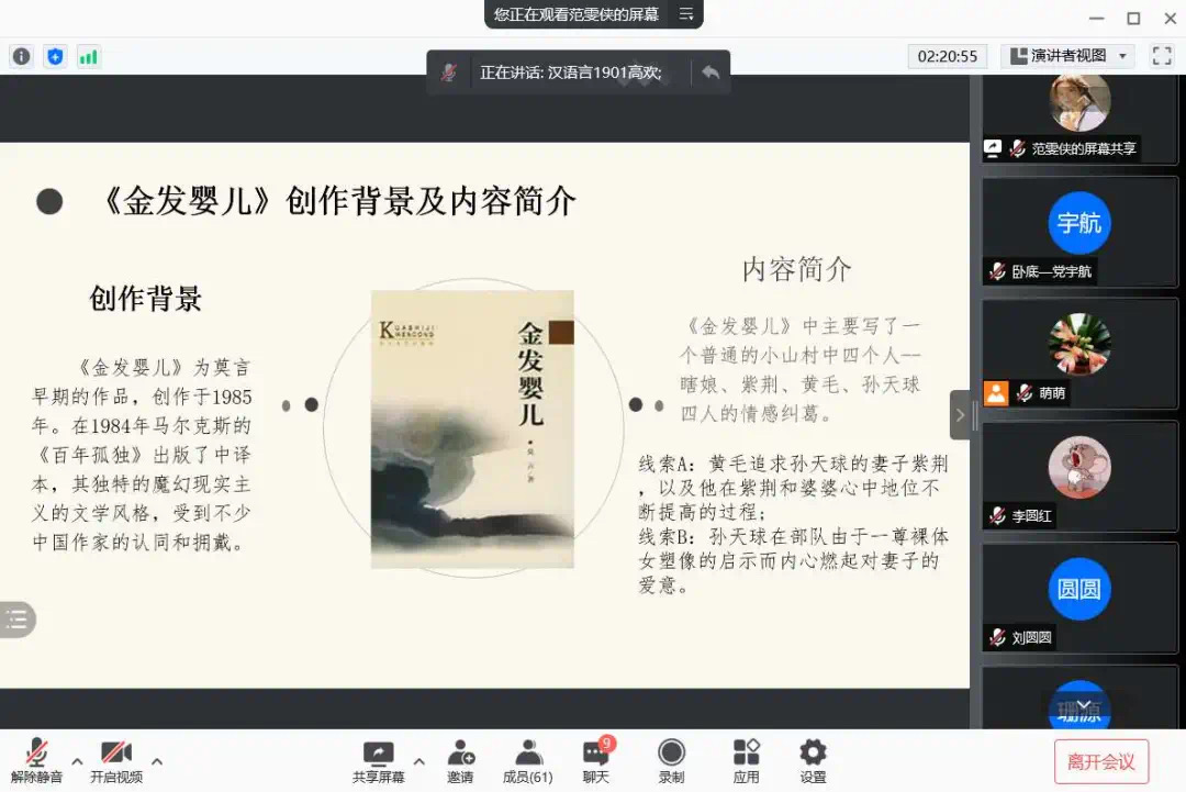 为了使大家多读书,好读书,读好书,并且“熟读而精思”,2021年10月11日,beat365在线唯一官网汉语言文学专业举办了以“莫言的小说”为主题的线上读书交流会。指导老师郭萌及汉语言文学专业19级全体同学参加活动。