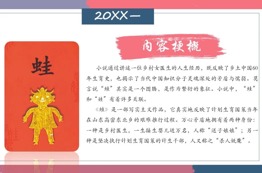第三组分享的作品是《蛙》,小组代表李思梦、闫海红、曾炜、樊丽斯分析了小说内容及人物形象,并通过探讨国家意志与人情伦理的激烈冲突,指出了中国计划生育的艰难历程。