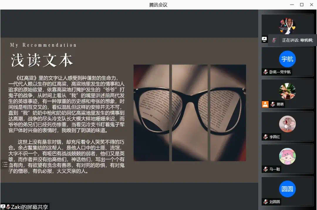 第七组分享的作品是《红高粱》,小组代表朱一帆通过与大家一起讨论小说中典型人物戴凤莲的人物特征,来展现“红高粱”精神。