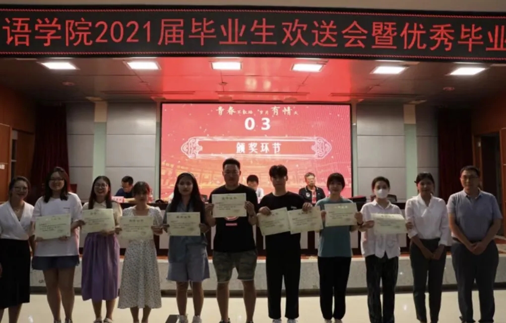 会上,学院副院长叶江宣读《beat365在线唯一官网关于表彰2021届毕业生先进集体及优秀个人的决定》。在欢快的乐曲声中,与会领导和全体教师代表分别为获得优秀毕业生、考研奖、基层志愿服务奖、优秀共产党员、优秀学生干部、就业工作先进个人、优秀宿舍优秀留学生奖的毕业生代表颁了奖,并合影留念。