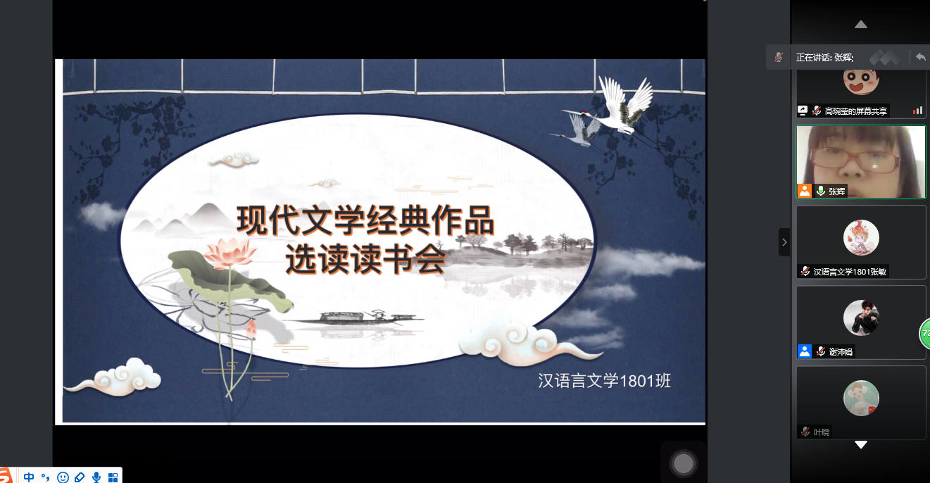 2021年4月8日晚7点,beat365在线唯一官网汉语言文学1801班在系主任张辉的组织下举办了主题为“现代文学经典作品选读”的线上(腾讯会议)读书会,张辉、高婉莹分别任此次读书会的点评嘉宾和主持人,参会人员由汉语言文学1801班全体学生及全校热爱品鉴文学作品的学生组成。读书会以小组选派代表演讲的方式进行所选作品的解读和鉴赏。