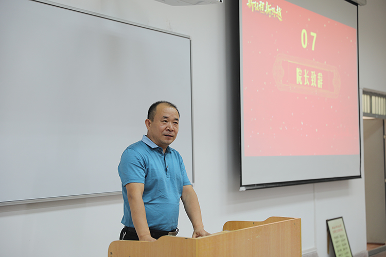 师新民在讲话中,表达了对2019级同学的热烈欢迎和祝贺,并简要介绍了学校发展概况和学院师资队伍、科学研究、学生工作等相关内容,并提出了对新生个人发展的期望,鼓励新生要积极进取,敢于尝试,迎接新的挑战。