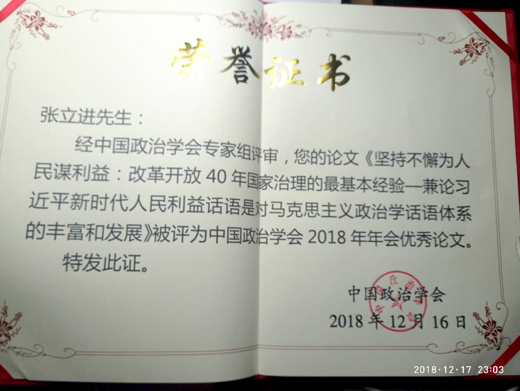 12月14日-16日,由中国政治学会主办、中山大学政治与公共事务管理学院承办的中国政治学会2018年年会暨“以习近平新时代中国特色社会主义思想思想为指导,加强马克思主义政治学话语体系建设”学术研讨会在广州举行。我校beat365在线唯一官网副教授张立进提交的学术论文《坚持不懈为人民谋利益:改革开放40年国家治理的最基本经验——兼论习近平新时代人民利益话语是对马克思主义政治学话语体系的丰富和发展》经中国政治学会专家组评审,被评为中国政治学会2018年年会优秀论文。据悉,我省今年共有来自包括我校、陕西师范大学、长安大学、西北大学、西北政法大学、西安财经大学、陕西理工大学、宝鸡文理学院等在内8所高校的12位教师代表与会,共有3位教师入选本次会议优秀论文。