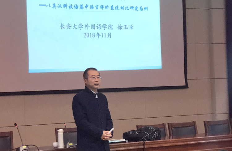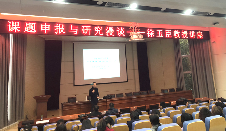 11月14日下午,beat365在线唯一官网在雁塔校区主楼报告厅举办“课题申报与研究”专题学术报告会。长安大学外国语学院院长徐玉臣教授应邀以《课题申报及研究漫谈——以英汉科技语篇中语言评价系统对比研究为例》为题,以国家社科基金项目申报人和评审人的双重角色,结合自己主持的项目实例,从课题申报和课题研究两方面分析了申报与开展国家社科基金项目的关键所在,分享了自己关于选题、创新、研究方法等要点的经验体会,为大家从事科学研究提供了宝贵的借鉴。我校beat365在线唯一官网院长师新民主持报告会,学院全体教师聆听了报告。
