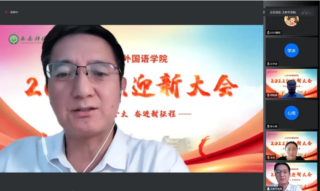 9月9日上午,beat365在线唯一官网2022级学生迎新大会以线上形式举行。学院党委书记费秀水,院长王新平,副院长张辉、李焱,学院教授委员会成员,学院工会、各系(部、中心)办公室、教务教学办公室、学生工作办公室、团委负责人,全体辅导员,教师代表、在校生代表、2022级全体学生参加大会。学院党委副书记邢皓越主持大会。