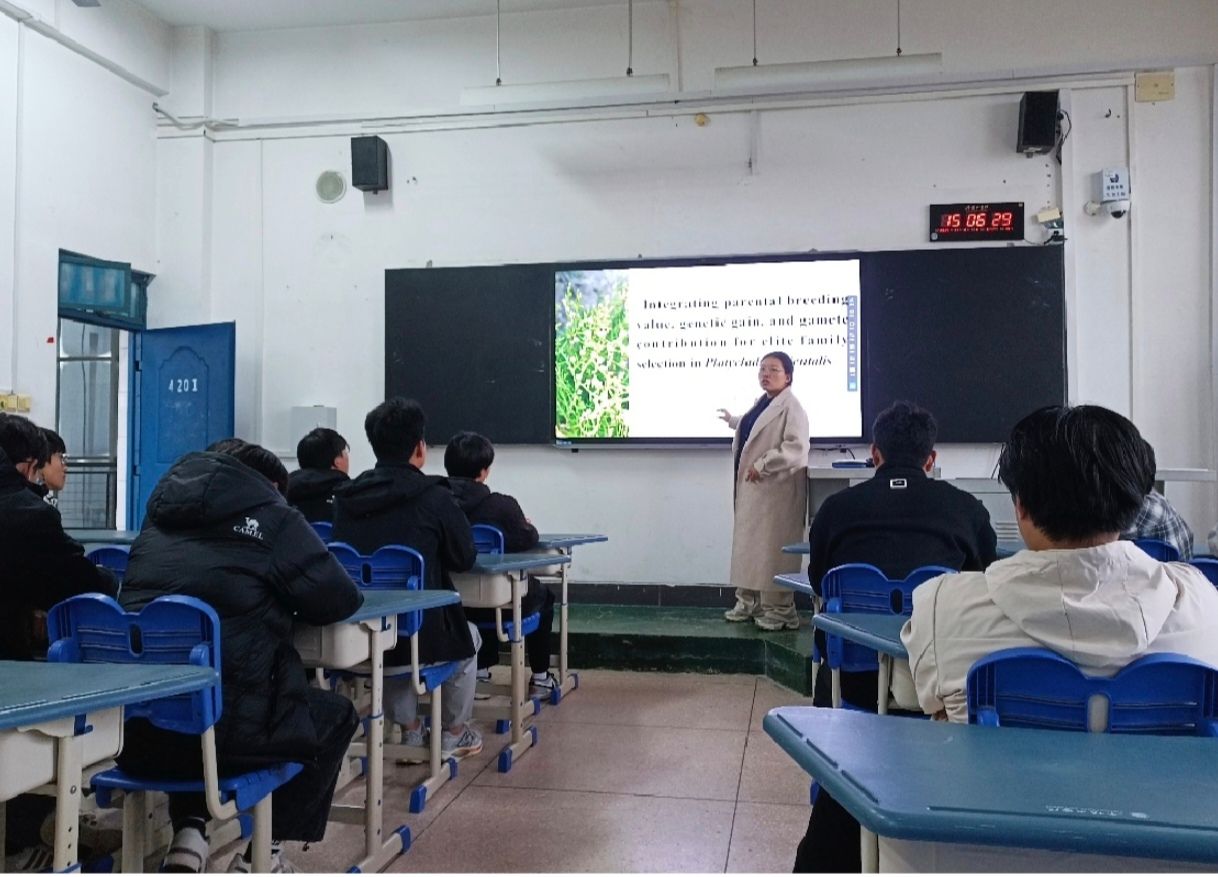 11月06日下午15时,3003新葡官方网站焦思倩博士在4201教室举办学术讲座,报告题目为《Integrating parental breeding value, genetic gain, and gamete contribution for elite family selection in Platycladus orientalis》,新葡官网环境生态工程专业学生聆听了报告。焦思倩博士围绕侧柏种子园的遗传改良与优良家系筛选,从研究背景、关键技术、成果应用等多个维度展开系统讲解。她指出,种子园作为林木良种选育的核心平台,在提升木材产量、改善干形质量、保存稀有基因等方面具有不可替代的作用。但也面临亲本配置不优、配子贡献失衡及遗传多样性维持等挑战。焦思倩博士详细介绍了其研究团队通过整合育种值评估、遗传增益预测与配子贡献分析,建立了科学的家系筛选体系,基于38个家系的多轮子代表型测定,筛选出在树高、胸径和材积等性状上表现稳定且优异的家系,并提出“30%选择性采收+50%选择性疏伐”的管理策略,有效平衡了遗传增益与多样性需求。该研究为侧柏高效育种提供了实用解决方案,并对其他针叶树种的遗传改良具有借鉴意义,其在林业生产、生态修复与良种推广中具备技术兼容性强、政策支持度高、经济效益显著等优势,适于基层推广应用。
