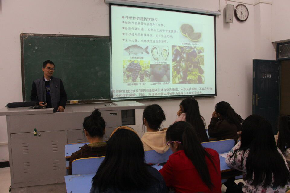 11月15日下午,3003新葡官方网站在L209教室召开了以“现代生物技术与植物育种”为主题的学术报告。程世平博士为此次学术报告主讲人,18级生态1班和化学1班全体学生听取了此次报告。