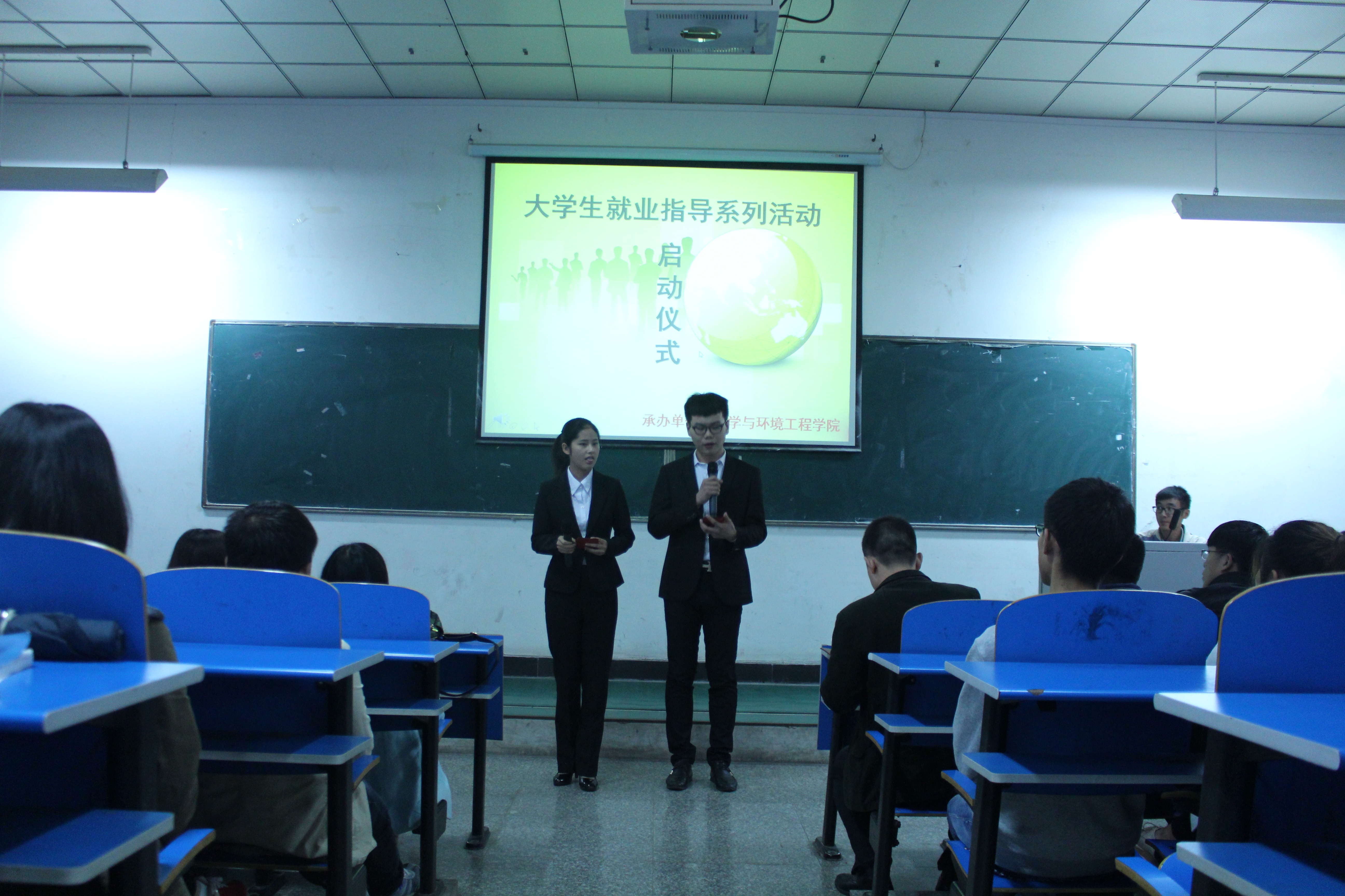 新葡官网于10月15日在教学楼2406举行了大学生就业指导系列活动启动仪式。辅导员马国杰老师、罗世颖老师及14级全体学生参加了本次活动。