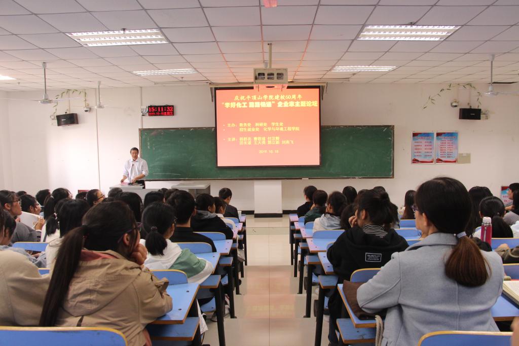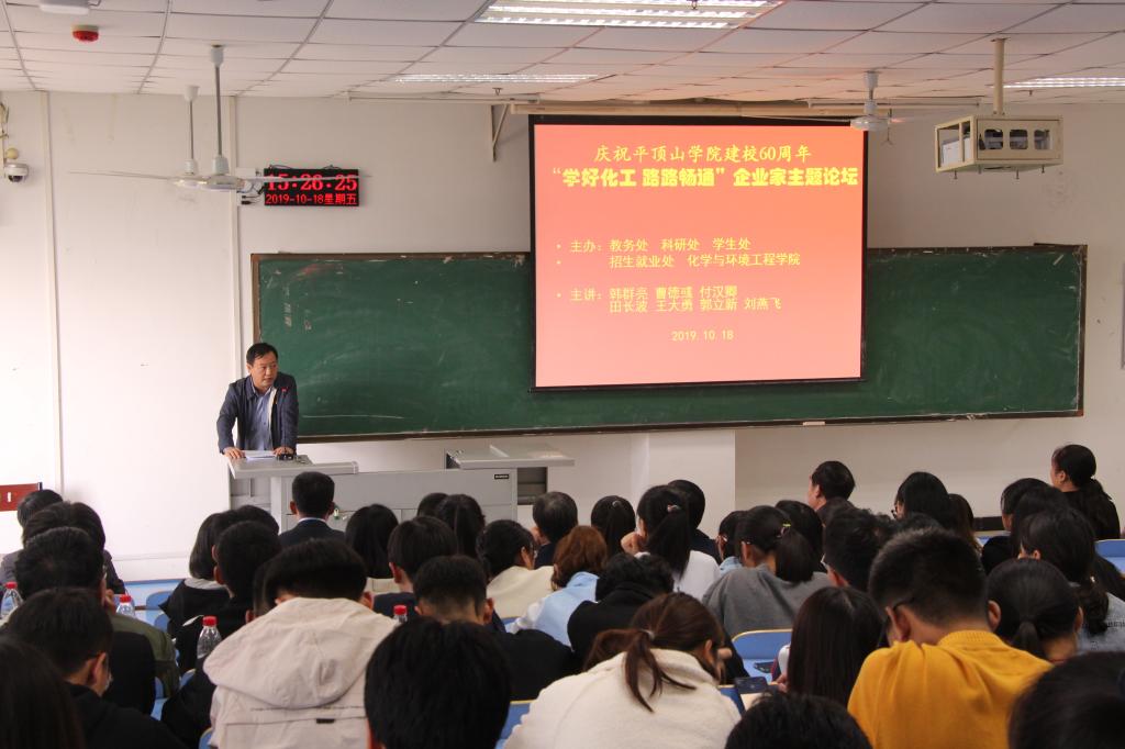 为庆祝平顶山学院建校60周年,由教务处、科研处、学生处、招生就业处、3003新葡官方网站共同主办的“学好化工 前路畅通”企业家主题论坛于10月18日下午在图书馆411教室举行。下午三点,活动正式开始,教室内座无虚席,过道、窗外听众爆满,来自化学工程与工艺、材料科学与工程等专业的200多名师生参加了活动。