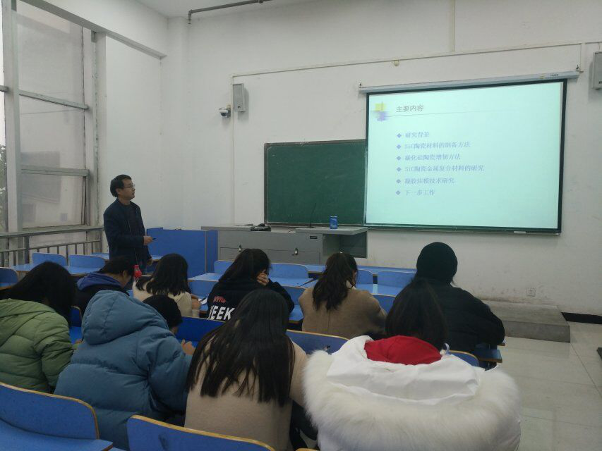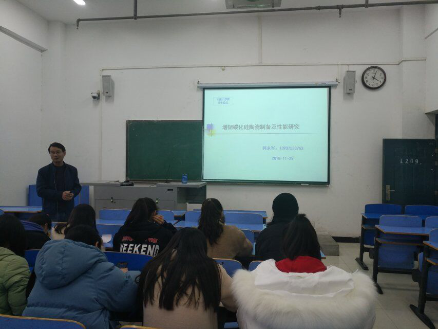 11月29日下午,3003新葡官方网站韩永军博士在L209进行了关于“增韧碳化硅陶瓷制备及性能研究”的学术报告。3003新葡官方网站18级化学1班、材料2班全体同学听取了此次学术报告。