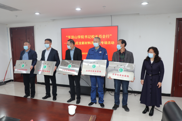 在热烈的掌声中,苏晓红分别为平煤神马集团尼龙科技有限公司、平顶山神马帘子布发展有限公司、平顶山神马工程塑料科技发展有限公司、河南氢化学有限公司、平顶山奥思达科技有限公司授“平顶山学院大学生就业基地”牌。