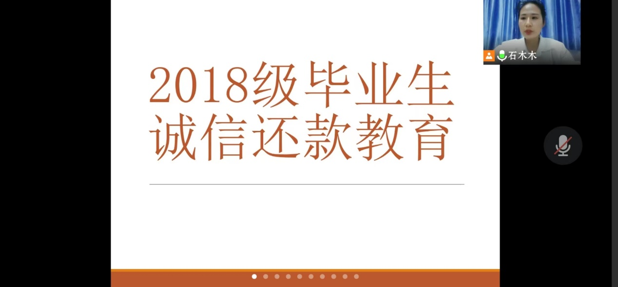 为贯彻落实立德树人根本任务,全面宣传党和国家的学生资助政策,充分发挥资助育人功能,增强毕业生的诚信意识和责任意识,新葡官网于4月21日在腾讯会议召开2022届贷款毕业生诚信还款教育大会,本次会议由石培琳老师主持,2022届全体办理助学贷款的同学参加此次会议。