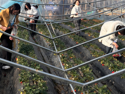 女职工走进采摘棚,采摘园内生机勃勃,翠绿的叶子、鲜红的果实、阵阵芬芳的果香,春日的气息扑面而来。采摘园草莓品种丰富,大家一边忙着采摘一边互相交流,充分感受大自然的气息,既体验了亲自采摘的乐趣,又品尝了鲜果的甜美。