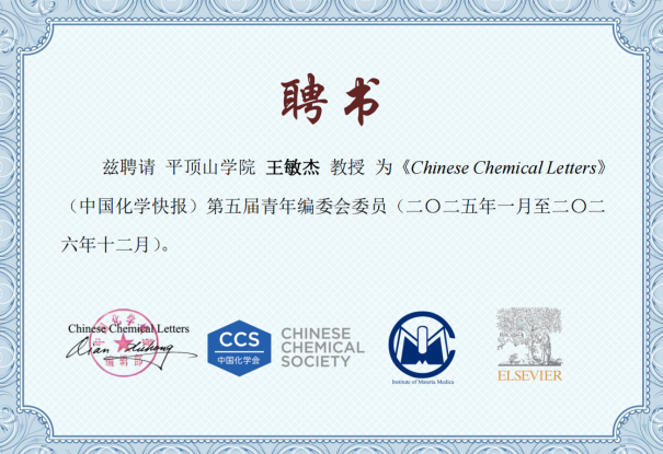 由中国化学快报编委会主办、江西师范大学化学与材料学院及多孔功能材料江西省重点实验室承办的第五届中国化学快报无机化学前言论坛于2024 年 12 月 11 至 13 日在江西省南昌市成功召开。会上来自北京大学、昆士兰大学、复旦大学、上海交通大学、香港理工大学、西安交通大学、平顶山学院等专家学者受聘担任第五届《中国化学快报》青年编委;参与同行评审,进行稿件初审以及推荐审稿人;推荐高质量研究成果与热点课题等。王敏杰博士此次受聘,凸显了我校学科发展与学术影响力的良好势头。