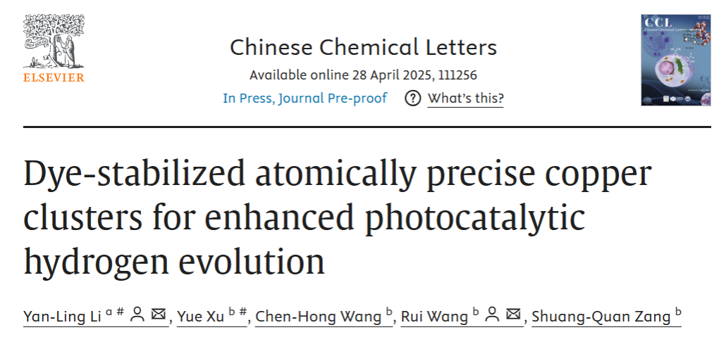 近日,3003新葡官方网站功能纳米材料研究团队与郑州大学王锐教授团队合作在国际著名期刊《Chinese Chemical Letters》(中科院1区,TOP期刊,影响因子9.4)上发表“Dye-stabilized atomically precise copper clusters for enhanced photocatalytic hydrogen evolution”的研究论文。3003新葡官方网站李艳岭博士为论文第一作者和共同通讯作者,平顶山学院为第一完成单位。