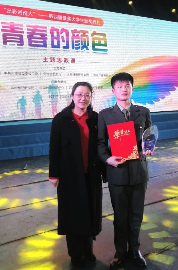 12月17日下午,“出彩河南人”第四届最美大学生颁奖典礼暨“青春的颜色”主题思政课在郑州西亚斯学院举行,新葡官网学子余志海在校学生处副处长盖伟、辅导员石培琳、刘苏艳的带领下参加了颁奖典礼,此次余志海获颁了“疫情防控和防汛救灾工作优秀大学生”荣誉称号。