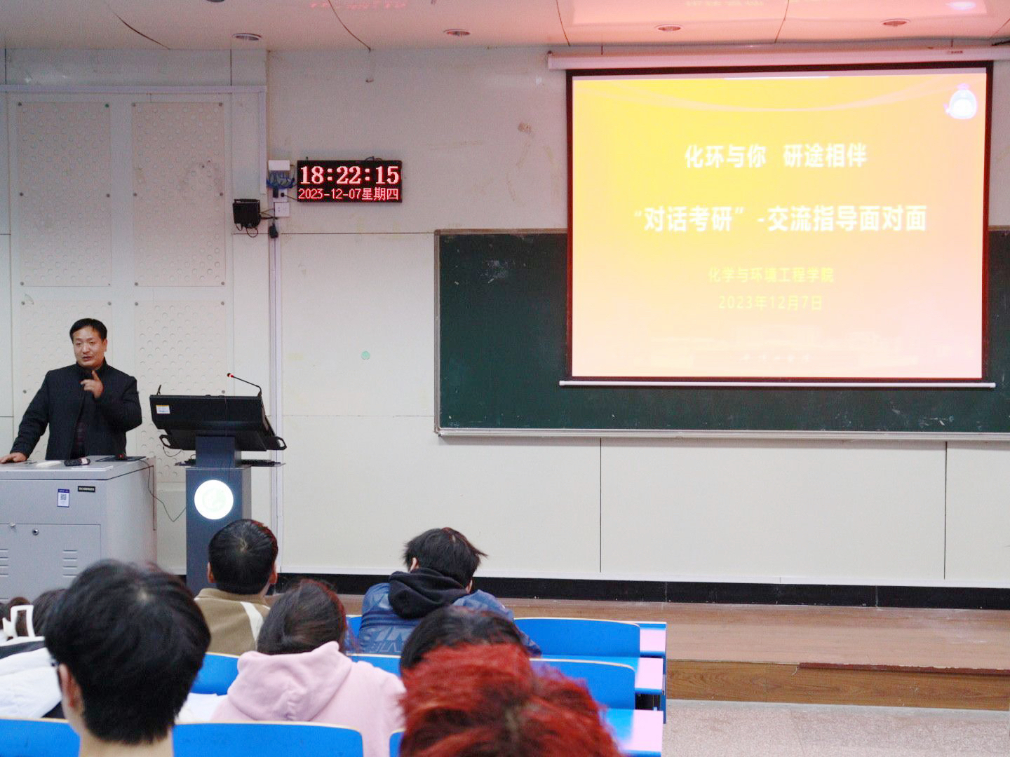 随后,贺书记分析了近几年硕士研究生考试的实际情况和考情变化,他以化学专业为例重点介绍了报考院校专业选择的技巧和注意事项。强调选择院校关键要结合自身学习情况、院校情况、专业发展情况等进行综合考虑,做出最适合自己的选择。提醒同学们要明确择校原则、避免择校误区,合理选择考研院校。接下来,他从专业角度出发,在时间规划、复习技巧、心态调整等方面给同学们做出具体有针对性的指导,他建议同学们在行动上要重视考研,在心态上要平和对待,鼓励大家在考研路上锐意进取、坚持不懈,殷切祝愿同学们考研成功,就业成功,实现自己人生理想。