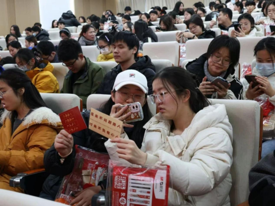 活动开始前,工作人员精心布置了会场,并在每一位考研学子的座位上放置了考研加油大礼包。打开礼包,里面惊喜连连。不仅有学弟学妹们亲手书写的祝福卡片,还有寓意着“心想事‘橙’”的橙子、象征着甜蜜与顺利的糖果和巧克力以及代表“笔下生花”的文具套盒,此外,在特别定制的可口可乐瓶上还印有每位考研学子的名字,并附上了专属的祝福语。这些礼物不仅实用,更蕴含着学院对每位考研学子美好未来的深深祝愿与贴心关怀。